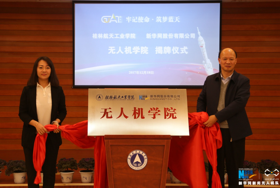 新华网股份有限公司无人机事业部负责人(左)与开云kaiyun登录入口党委书记李幼平为无人机学院揭牌。新华网发 杨永昌摄