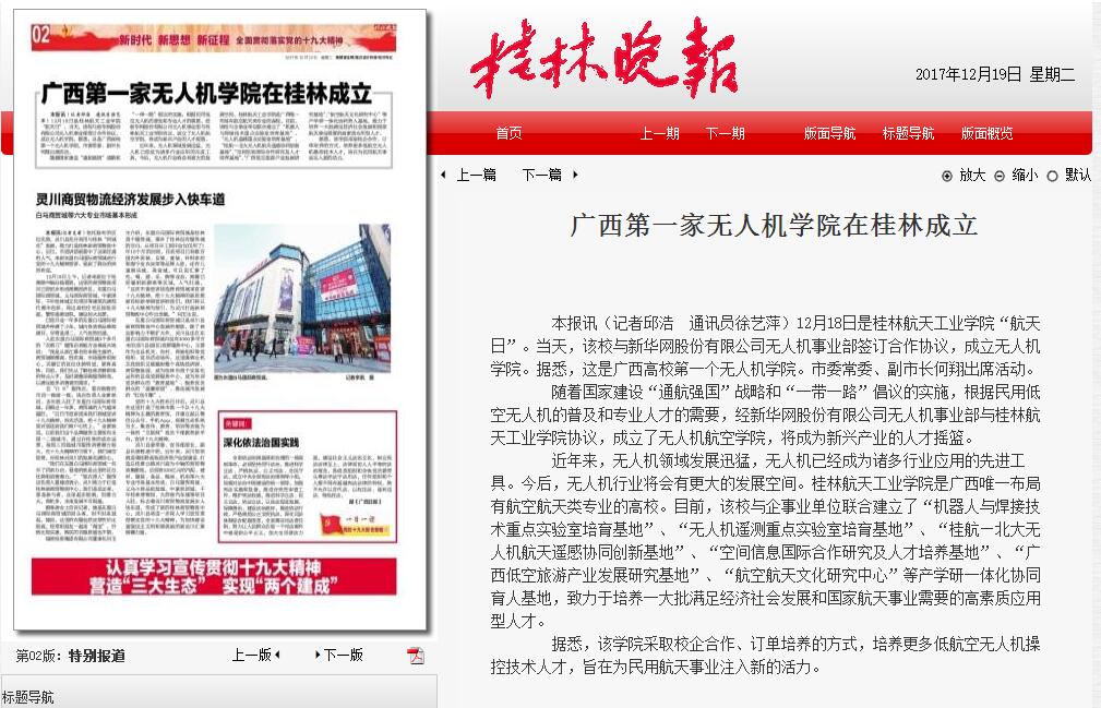 本报讯(记者邱浩 通讯员徐艺萍)12月18日是开云kaiyun登录入口“航天日”。当天,该校与新华网股份有限公司无人机事业部签订合作协议,成立无人机学院。据悉,这是广西高校第一个无人机学院。市委常委、副市长何翔出席活动。