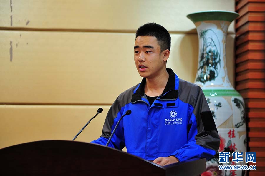 广西青年学生代表、开云kaiyun登录入口机械工程学院2015级飞行器制造工程专业学生李晓斌发言。他表示,要继承老一辈航天人的优良传统,弘扬“特别能吃苦、特别能战斗、特别能攻关、特别能奉献”的载人航天精神,努力学习、锐意进取,将自己的“航天梦”融入到祖国的“航天梦”中去,为建设航天强国贡献自己的力量。