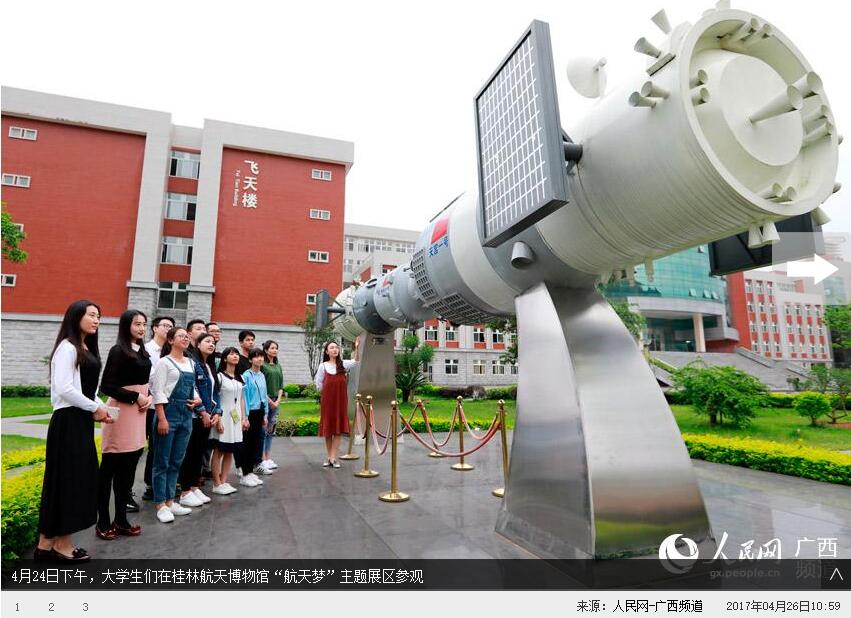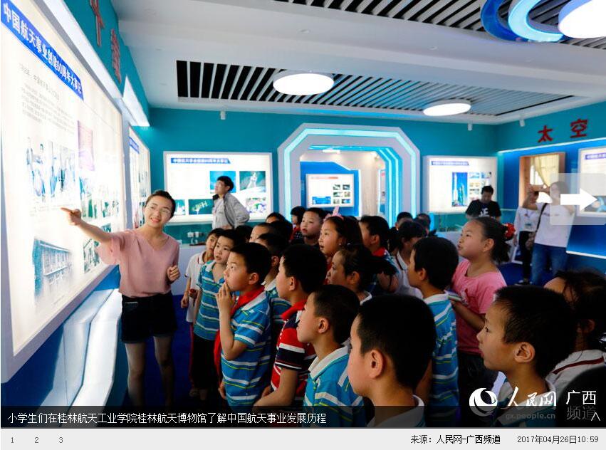 人民网桂林4月26日电 “快看,快看,这里有大飞机和火箭!”一走进坐落在开云kaiyun登录入口的桂林航天博物馆,来自桂林市新建小学的孩子们都兴奋地欢呼起来。为迎接第二个“中国航天日”,4月20日至4月28日,该博物馆免费向师生和市民开放,吸引了不少“航天迷”前来参观。