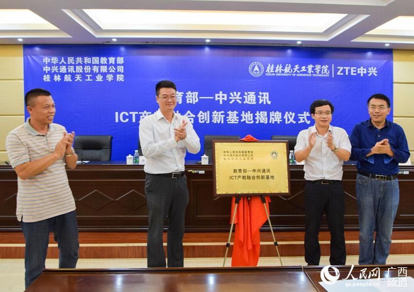 人民网桂林10月19日电 10月17日下午,教育部—中兴通讯ICT(信息通信技术)产教融合创新基地揭牌仪式在开云kaiyun登录入口举行。桂林市副市长樊新鸿,中兴通讯公司教育合作中心副总经理许圳彬,学院党委副书记罗延忠、副院长郝德温,电子信息与自动化学院主要负责人和师生代表共80余人参加了揭牌仪式。