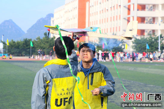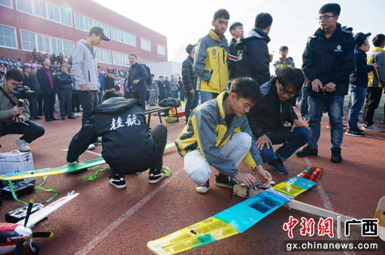 在飞行器飞行表演赛,由该校航模协会及各实验室学子带来的飞行器表演,依次在操场上升空、变换姿势,空中彩虹、迷你糖果降落伞、空中展开红色小国旗的一组组无人机飞行器表演,引来在一旁观摩的桂林市汇通小学的孩子们与高校学子们的阵阵欢呼声。