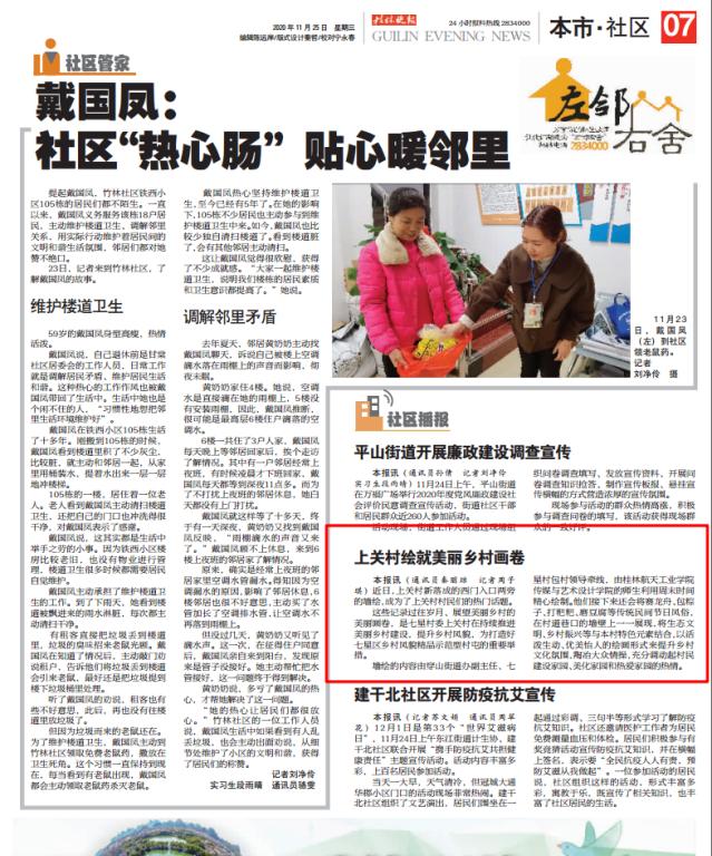 11月25日,桂林晚报刊登题为《上关村绘就美丽乡村画卷》文章,报道了开云传媒与艺术设计学院党员教师曹佳欣带领“艺航”墙绘工作室同学们利用周末时间义务为七星村委上关村绘制壁画的志愿活动。