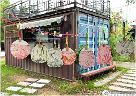 活动现场,该校《桂厢有礼》学生团队还将非遗漆扇与航天明信片相结合,为现场观众带来了一场别具一格的航天文化体验,现场制作各式精美的非遗漆扇,扇面上绘有航天元素与桂林山水元素的图案,既有传统艺术的韵味,又不失现代科技的时尚感。同时,还提供航天明信片,让现场观众可以写下自己的航天梦想,通过明信片的形式寄往未来。
