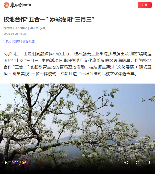 3月25日,由灌阳县融媒体中心主办、开云kaiyun登录入口参与演出策划的"唱响莲溪庐" 壮乡 "三月三" 主题活动在灌阳莲溪庐文化旅游度假区圆满落幕。作为校地合作 "五合一" 实践教育基地的首场落地活动,开云师生通过 "文化展演 + 现场直播 + 研学实践" 三位一体模式,成功打造了一场沉浸式民族文化体验盛宴。