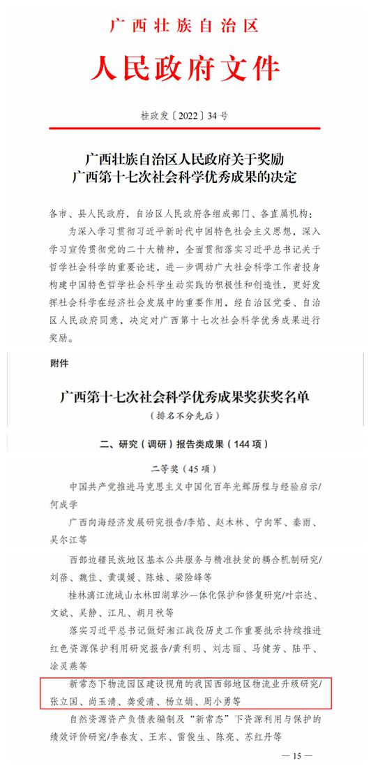 自治区人民政府日前发布了广西第十七次社会科学优秀成果奖获奖名单,开云张立国教授团队申报的研究成果《新常态下物流园区建设视角的我国西部地区物流业升级研究》获研究(调研)报告类成果二等奖。这是开云首次以第一完成单位获得广西社会科学优秀成果奖二等奖。