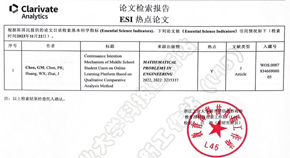 近期,管理学院教师陈国民博士的论文《Continuance Intention Mechanism of Middle School Student Users on Online Learning Platform Based on Qualitative Comparative Analysis Method》被评选为ESI(Essential Science Indicators)热点论文。