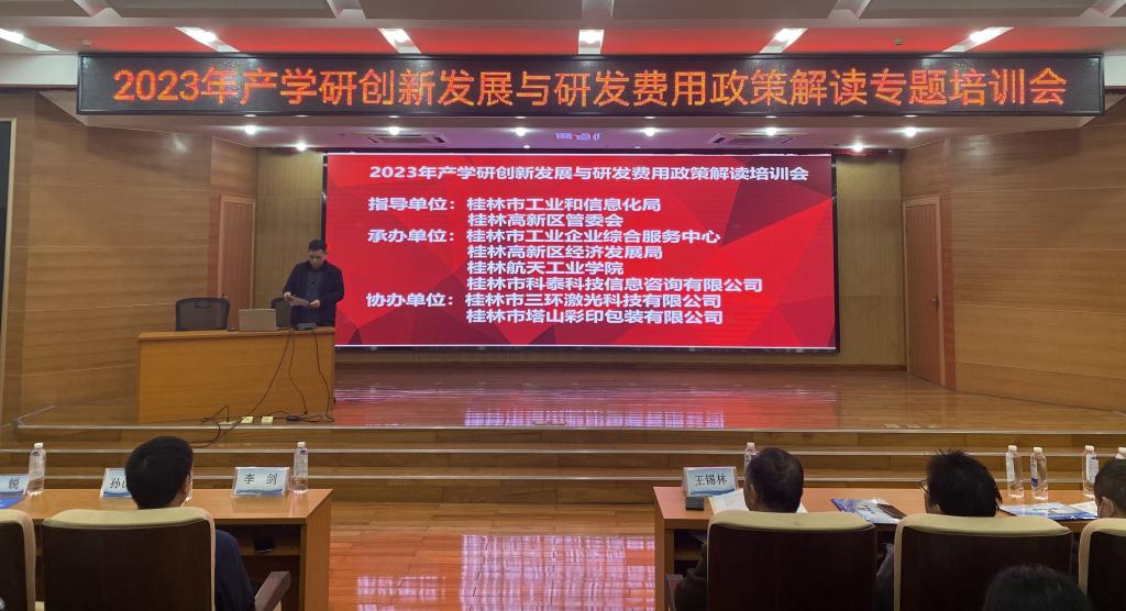 12月14日,由桂林市工业和信息化局、桂林高新区管委会主办,开云和桂林市中小企业服务中心、桂林高新区经济发展局、桂林市科泰科技信息咨询有限公司联合承办的“产学研创新发展与研发费用政策解读专题培训会”在高新区创意大厦举行。桂林高新区管委会副主任李剑、桂林市中小企业服务中心书记王锡林、桂林高新区经发局局长董冰等领导以及79家桂林市企业代表出席活动。开云副校长孙山林出席并致辞,科技处相关领导及教师代表参加了此次活动。