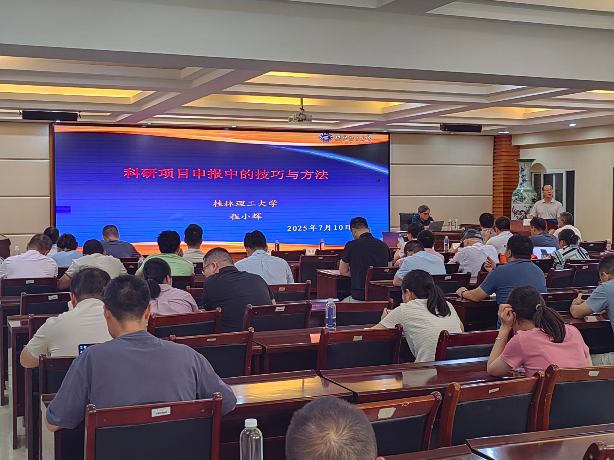 为推动学校2026年广西科技计划项目申报工作,提升项目申报质量与立项成功率,7月10日上午,学校特邀广西师范大学刘俊秀教授、桂林理工大学程小辉教授,在飞天楼520会议室分别作《广西自然科学基金项目的申报》《科研项目申报中的技巧与方法》主题讲座。本次讲座由科技处负责人主持,全校近百名教师参与。