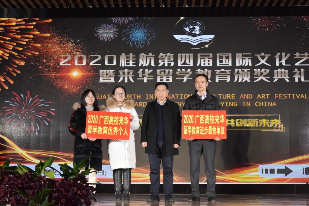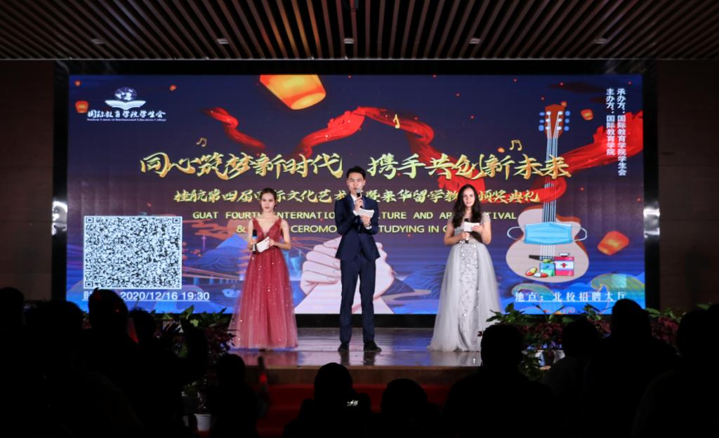 12月16日晚,以“同心筑梦新时代,携手共创新未来”为主题的开云第四届国际文化艺术节暨来华留学教育颁奖典礼在北校区招聘大厅隆重举行。副校长孙山林,桂林电子科技大学、桂林理工大学、桂林医学院、桂林旅游学院以及开云校办、学生工作部、教务处、保卫处、体育部、国际学院等相关负责人及近300名师生共同参加了此次晚会。