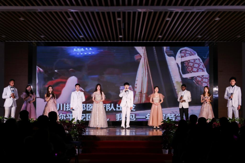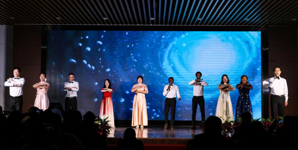 会上,来自五湖四海的留学生带来了歌舞、朗诵、乐器演奏等精彩节目,为观众呈现了别具一格的视听盛宴。桂林医学院留学生们表演的《南亚各民族舞蹈串烧》动作优美,引人入胜。桂林电子科技大学同学们演唱的《我爱你中国》引起全场师生的共鸣。一首《不放弃》道尽中国人民“不胜疫情,绝不放弃”的决心。乌兹别克斯坦民族舞蹈《霍雷斯姆•拉兹吉》节奏欢快,带我们走进了充满异域风情的世界。非洲时装秀将晚会推上了整场晚会的高潮,各具一色的非洲民族服饰尽揽眼帘,让观众们为之惊叹。来自桂林理工大学津巴布韦学生的架子鼓独奏《逆战》赢得了满堂喝彩。泰国和印尼的太极拳,让我们感受到传统太极武术的刚柔并济与盛世凌人。整场晚会精彩不断,高潮迭起,赢得台下阵阵掌声,一首《坚信爱会赢》为整场晚会画下了圆满的句号。