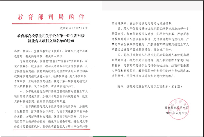 据悉,供需对接就业育人项目系今年首次实施,是教育部高校学生司深入贯彻落实党中央、国务院“稳就业”“保就业”决策部署,深化产教融合、校企合作,推动学校人才培养与就业有机联动、人才供需有效对接,经高校申请、用人单位申报、专家审核、立项单位信息核查确定立项,由企业提供经费支持。