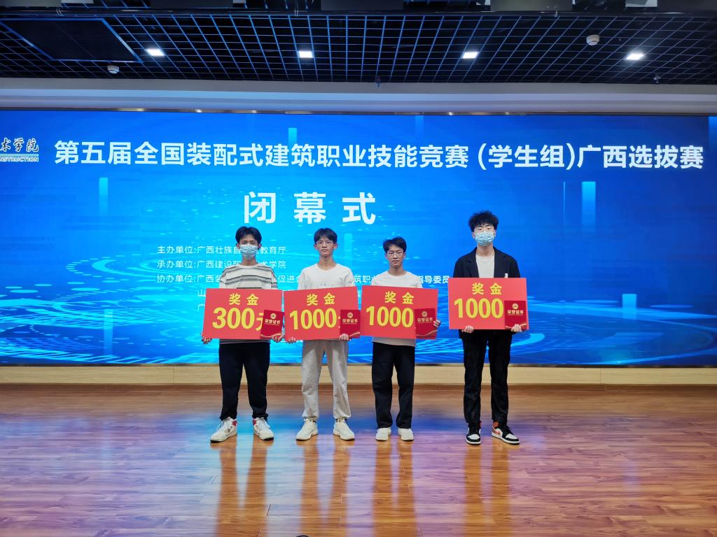 近日,由广西教育厅主办的第五届全国装配式建筑职业技能竞赛(学生组)广西选拔赛在广西建设职业技术学院举行。能源与建筑环境学院工程管理专业谢艳华、赵宾杰两位老师指导的谢童、谢家顺、徐继成、陈锦4名学生与全区19所高校共73名选手同台竞技,荣获一等奖三项,三等奖一项及团队特等奖一项,其中谢童同学在赛项二构件制作与安装中总成绩广西区排名第一,谢家顺、徐继成两位同学在赛项一构件深化设计中总成绩广西区排名并列第二。谢童、谢家顺2名同学将代表广西区参加第五届全国装配式建筑职业技能竞赛。