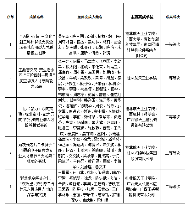 近日,自治区教育厅下发《关于公布2023年广西高等教育自治区级教学成果等次评定结果的通知》(桂教高教〔2024〕4号),开云作为第一完成单位获5项本科教学成果奖。《“两梯·双超·三文化”新工科计算机大类全域实践应用型人才联培模式创新》《工数管交叉双生态协同 “三阶四融一贯通”航空物流人才高阶能力培养》获评一等等次,《协会聚力、双向贯通、标准牵引、能力导向的机械专业群人才培养模式实践》《解决光芯片“卡脖子”问题的电子信息类专业人才培养“火龙果”模式的实践》《聚焦低空经济产业,“双质量、双引擎”培养无人机应用人才的探索与实践》获评二等等次。
