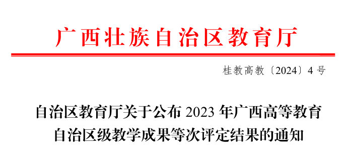广西高等教育自治区级教学成果等次评定工作的开展是贯彻落实全国和自治区科教兴国、人才强国、创新驱动发展等战略和落实立德树人根本任务的重要举措,是对我区高校人才培养工作和教育教学改革进展和成绩的体现。获奖成果是学校近年来立德树人、潜心教书育人和教学改革等方面特色与成效的具体体现,展现了学校在教育教学改革、应用型人才培养模式等工作中所取得的新成就。评选工作开展以来,学校领导高度重视,教务处多次邀请校内外专家指导成果负责人进行预答辩和修改材料,为教学成果成功评选奠定了坚实基础。下一步,学校将以此为契机,健全教学成果培育、表彰激励、推广应用机制,充分发挥优秀成果的示范引领作用,全面提高学校本科教学质量。
