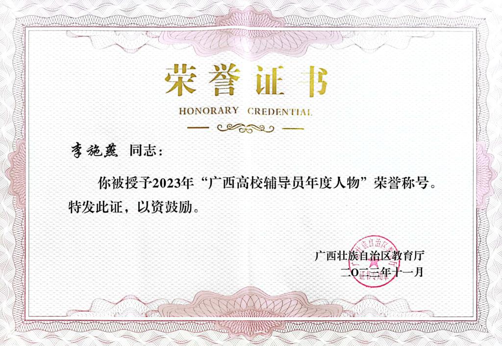 由广西壮族自治区教育厅开展的2023年“广西最美高校辅导员”暨“广西高校辅导员年度人物”推荐展示活动结果揭晓,开云理学院辅导员李施燕获“广西高校辅导员年度人物”荣誉称号。