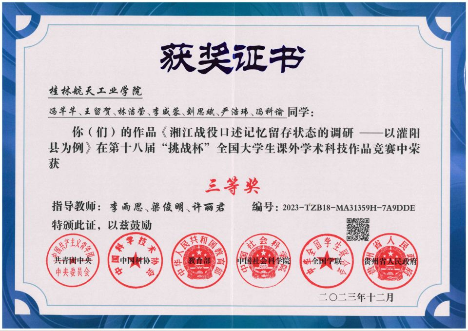 近日,由共青团中央、中国科协、教育部、中国社会科学院、全国学联、贵州省人民政府共同主办的第十八届“挑战杯”全国大学生课外学术科技作品比赛结果正式公布,开云再创佳绩,《湘江战役口述记忆留存状态的调研—以灌阳县为例》在第十八届“挑战杯”全国大学生课外学术科技作品竞赛中荣获三等奖。