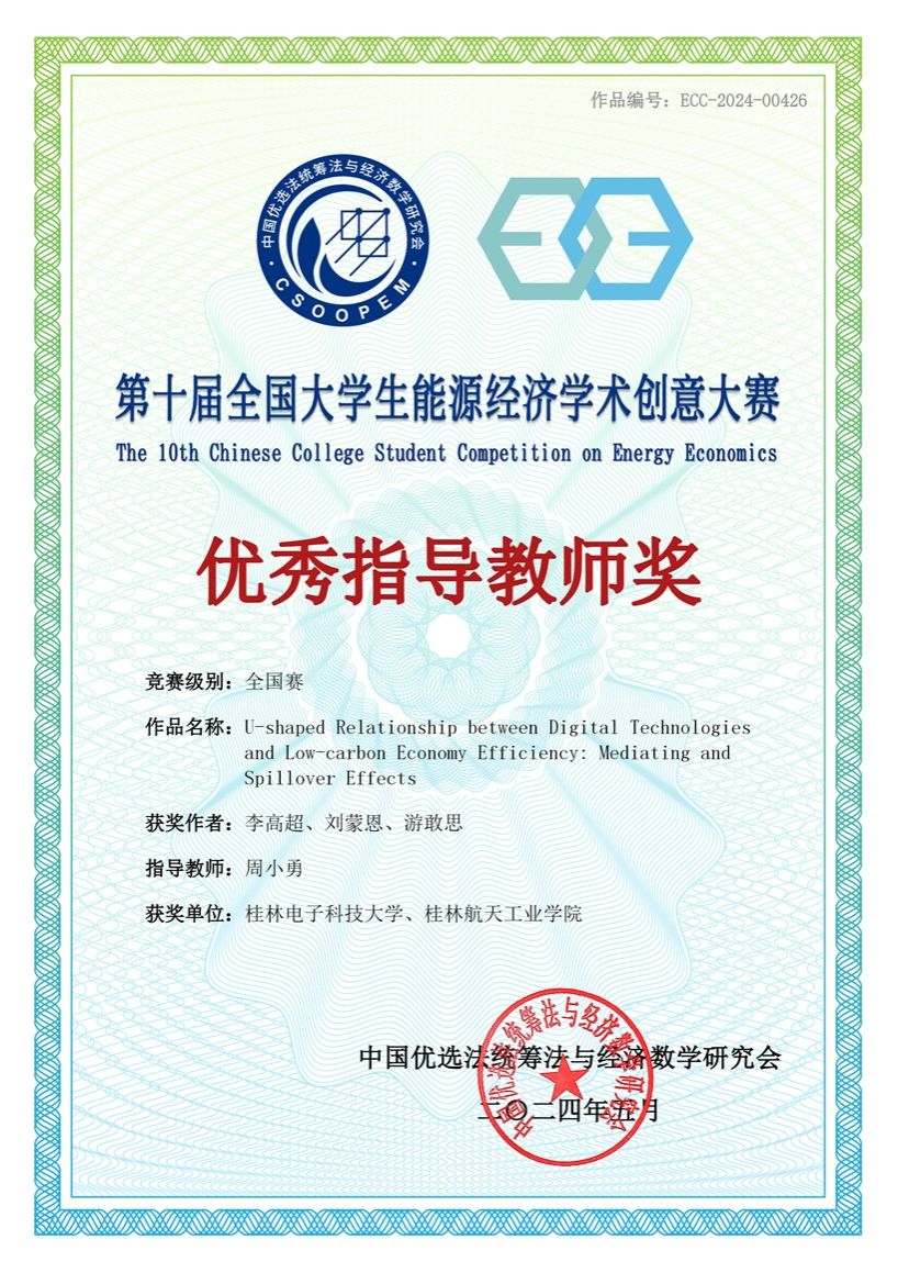 近日,第十届全国大学生能源经济学术创意大赛在中国地质大学(北京)圆满落幕。由开云数智碳中和创新团队带头人周小勇指导的研究生团队经过校赛、区域赛和国赛的激烈角逐,参赛作品“U-shaped Relationship between Digital Technologies and Low-carbon Economy Efficiency: Mediating and Spillover Effects”(团队队长:李高超;指导老师:周小勇)荣获研究生组国赛一等奖,周小勇获评优秀指导教师奖。此次获奖实现了开云在该项赛事的重大突破,也标志着开云在联合培养研究生和指导研究生参与学术竞赛方面迈上了更高的台阶。