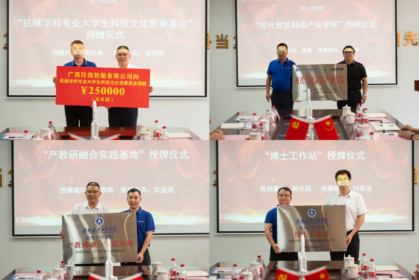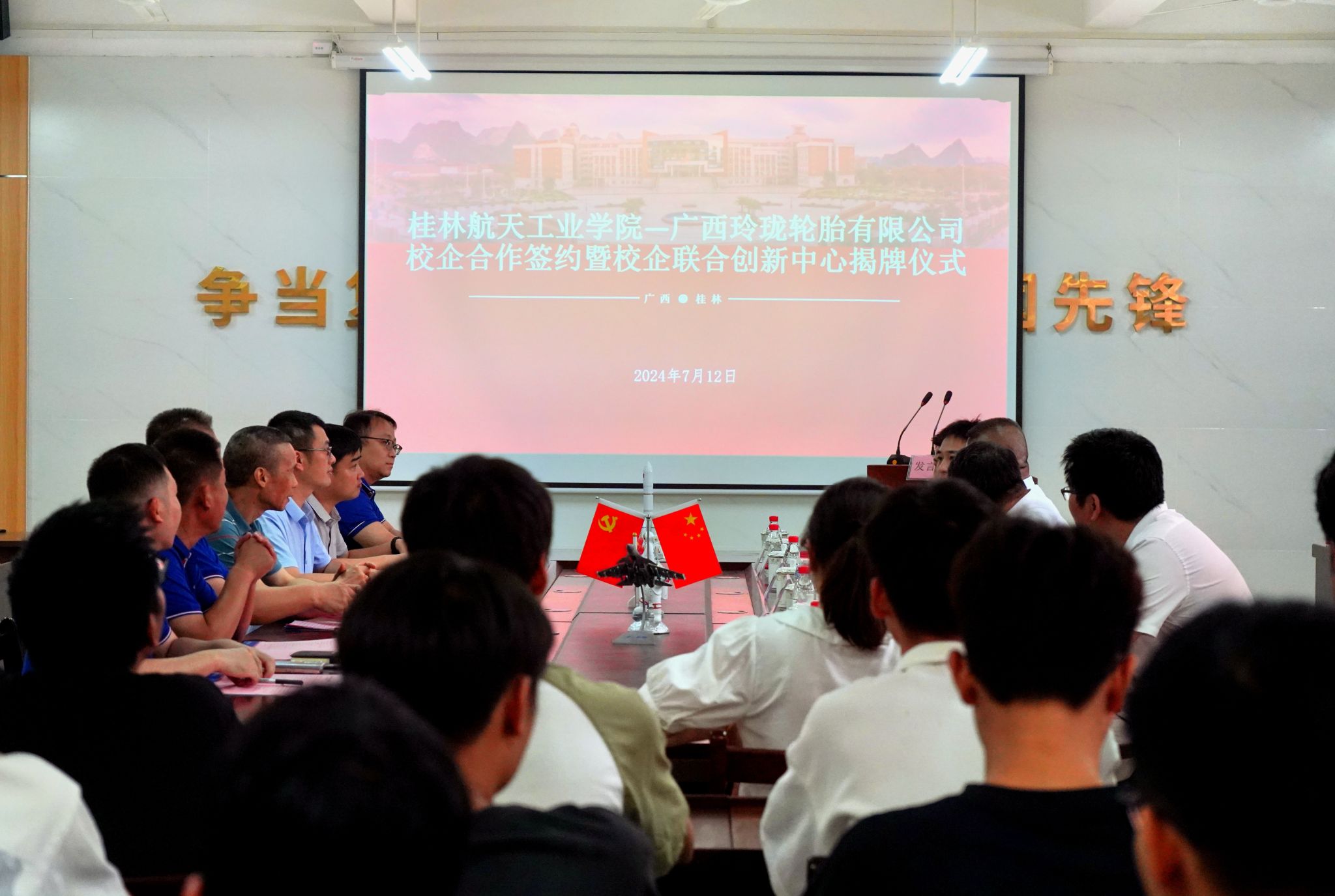 为推动产教融合发展,实现“共赢未来人才”“共享优势资源”“共建发展共同体”目标,助推校企双赢及高质量发展,7月12日下午,开云kaiyun登录入口与广西玲珑轮胎有限公司校企合作签约暨校企联合创新中心揭牌仪式在巡天楼举行。柳州市科技局一级调研员郑晓鸿、柳东新区管委副主任黄敏、柳州市科技局农业农村与社会发展科技科科长周毓婷等政府领导,广西玲珑轮胎有限公司总经理杨科峰等企业代表,学校副校长张烈平,科技处负责人及机电工程学院负责人、80余名师生代表参加会议。