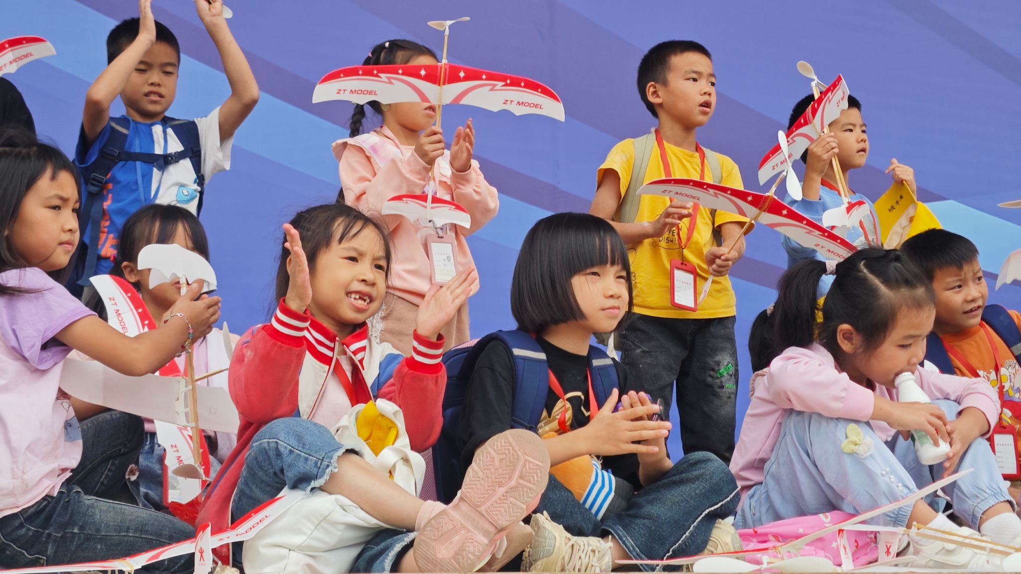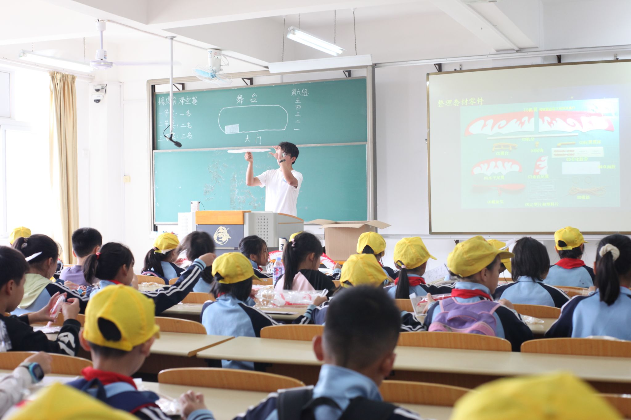 除了参观学习所外,同学们踊跃参与各项科技兴趣活动,在风雨足球场观看航模飞行表演时同学们欢呼雀跃;在航模制作理论知识学习时小朋友们专心致志;在教室动手制成橡皮筋飞机和纸飞机后他们开心自豪;在青春广场亲手放飞自己作品,小朋友们激情四射。