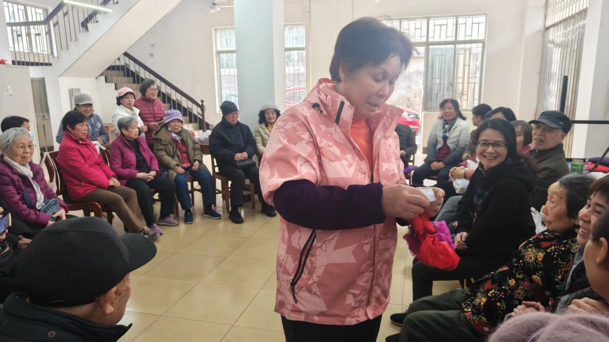 在活动现场,葛莉和老同志亲切交流,嘘寒问暖,老同志们对学校和领导的关怀非常感动,他们精神抖擞、容光焕发,开开心心地玩着代表着幸运和有趣的游园活动,掌声、欢乐声、锣鼓声响成一团,现场的气氛温馨、热烈。