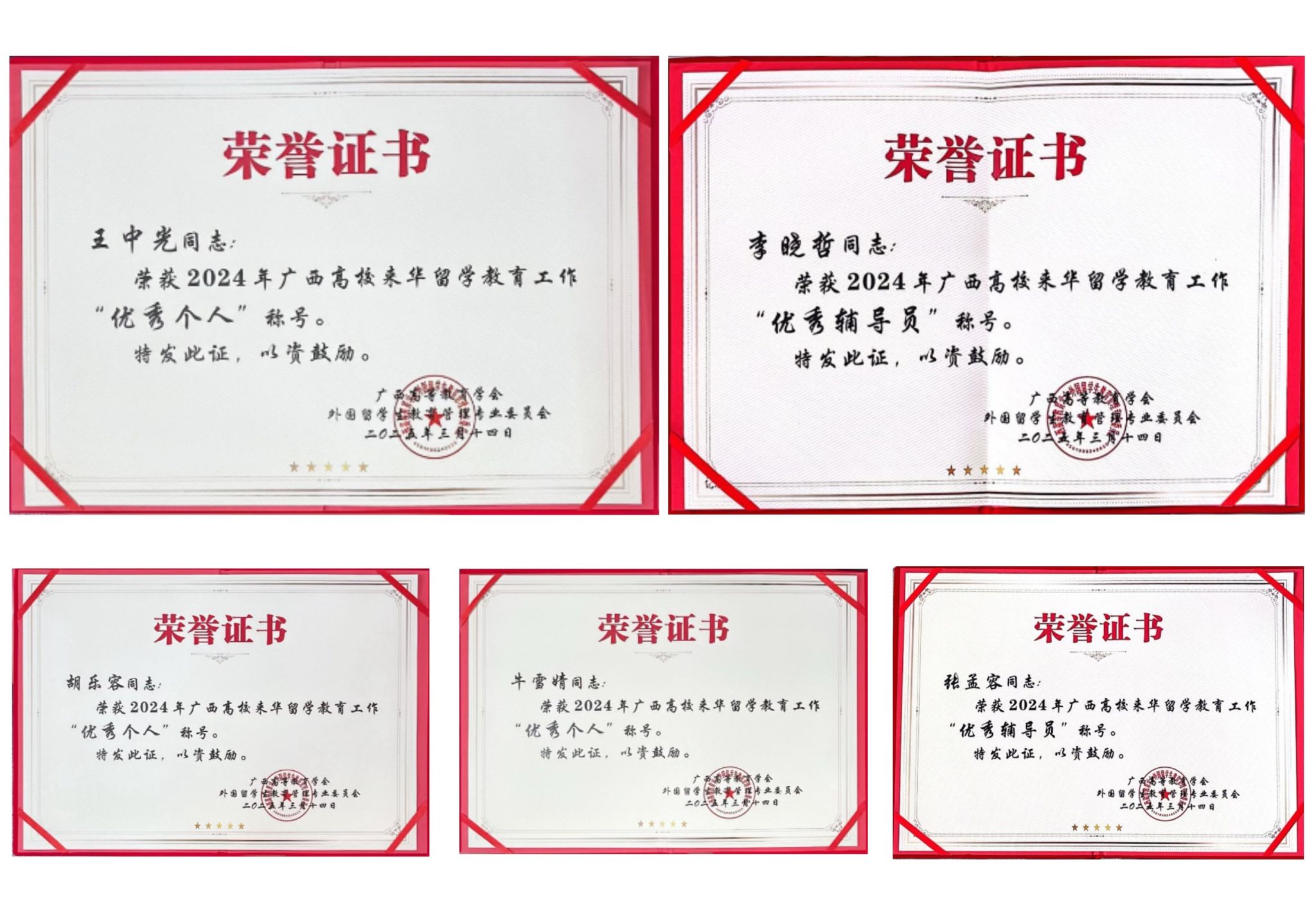 2025年3月14日,由广西留管学会组织的“广西高教会外国留学生教育管理专业委员会2024年年会暨表彰大会”在桂林理工大学隆重举行,开云王中光等三名教师荣获“广西来华留学教育优秀个人”,李晓哲等两名教师获“广西来华留学教育优秀辅导员”荣誉称号。